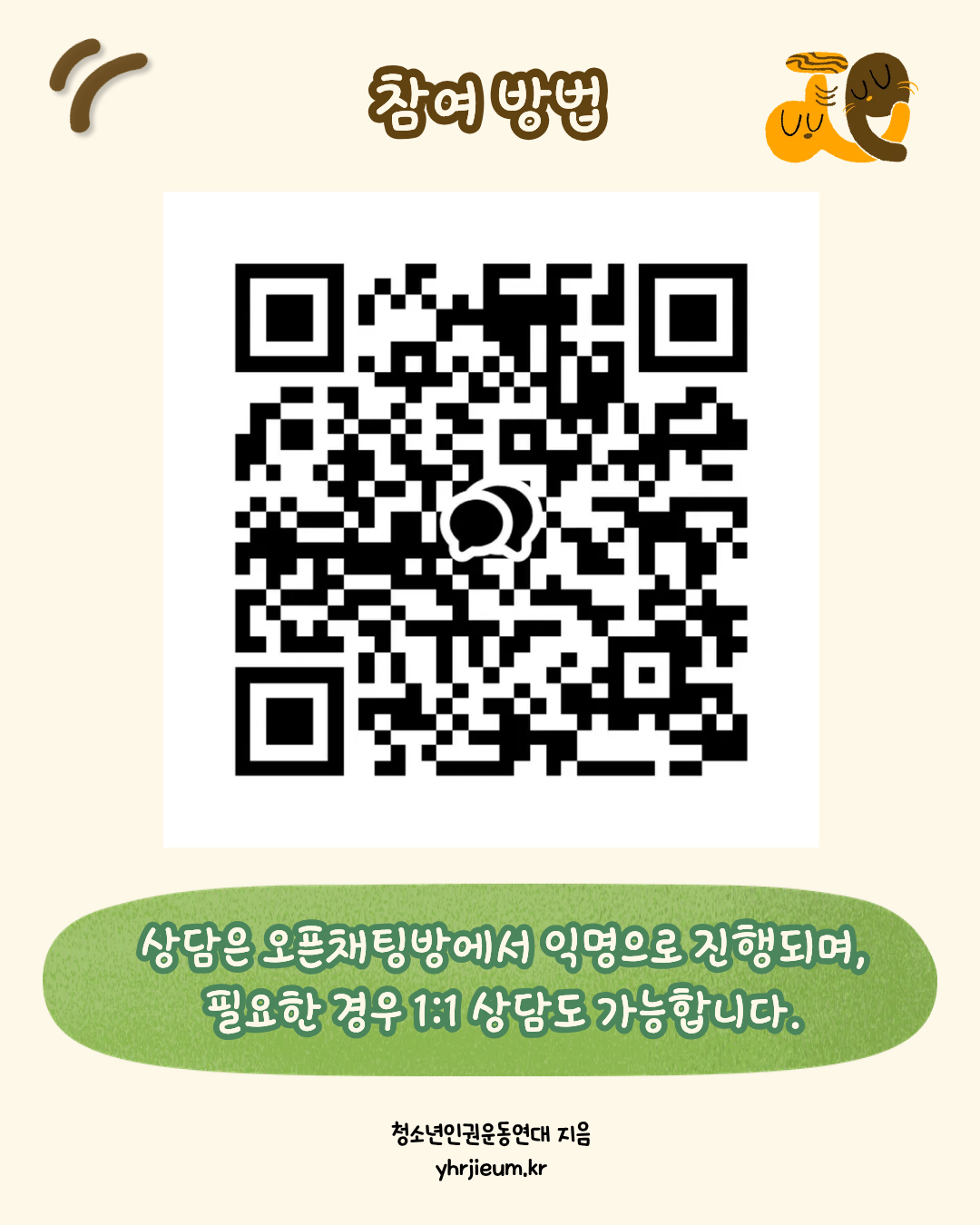 상담은 오픈채팅방에서 익명으로 진행되며, 필요한 경우 1:1 상담도 가능합니다.