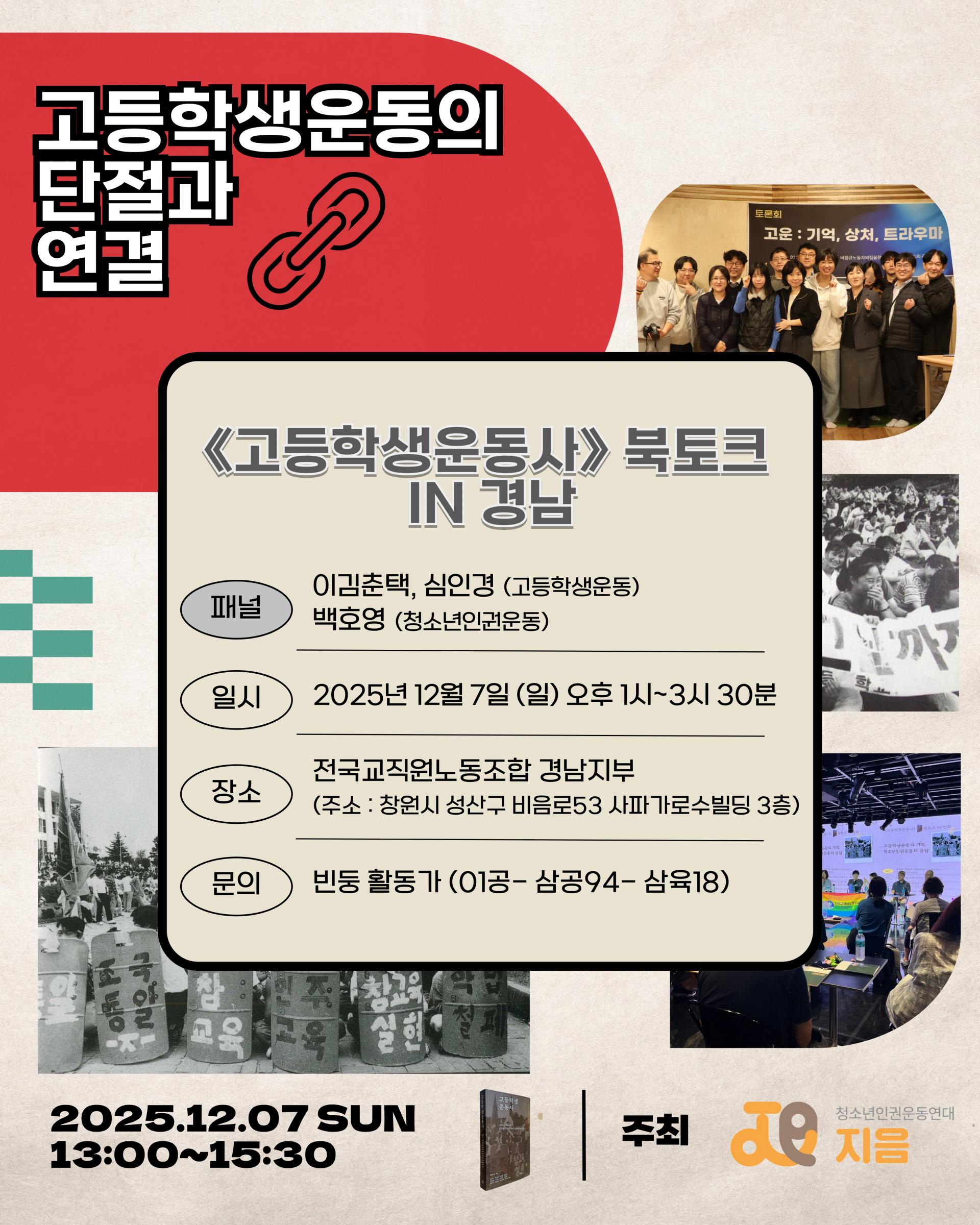 지난 7월, 전주에서 진행한 《고등학생운동사》 북토크 "고등학생운동의 기억, 청소년인권운동의 응답"에 이어 이번에는 경남 창원에서 행사를 엽니다. 고등학생운동이 현재 사회 및 운동과 어떻게 연결될 수 있는지 함께 이야기 나누고자 합니다. 지음이 고등학생운동에 질문을 던지고 이야기를 듣는 청자이자 기록자로서의 활동이 꾸준히 이어갈 수 있도록, 많은 관심과 참여 부탁드려요!