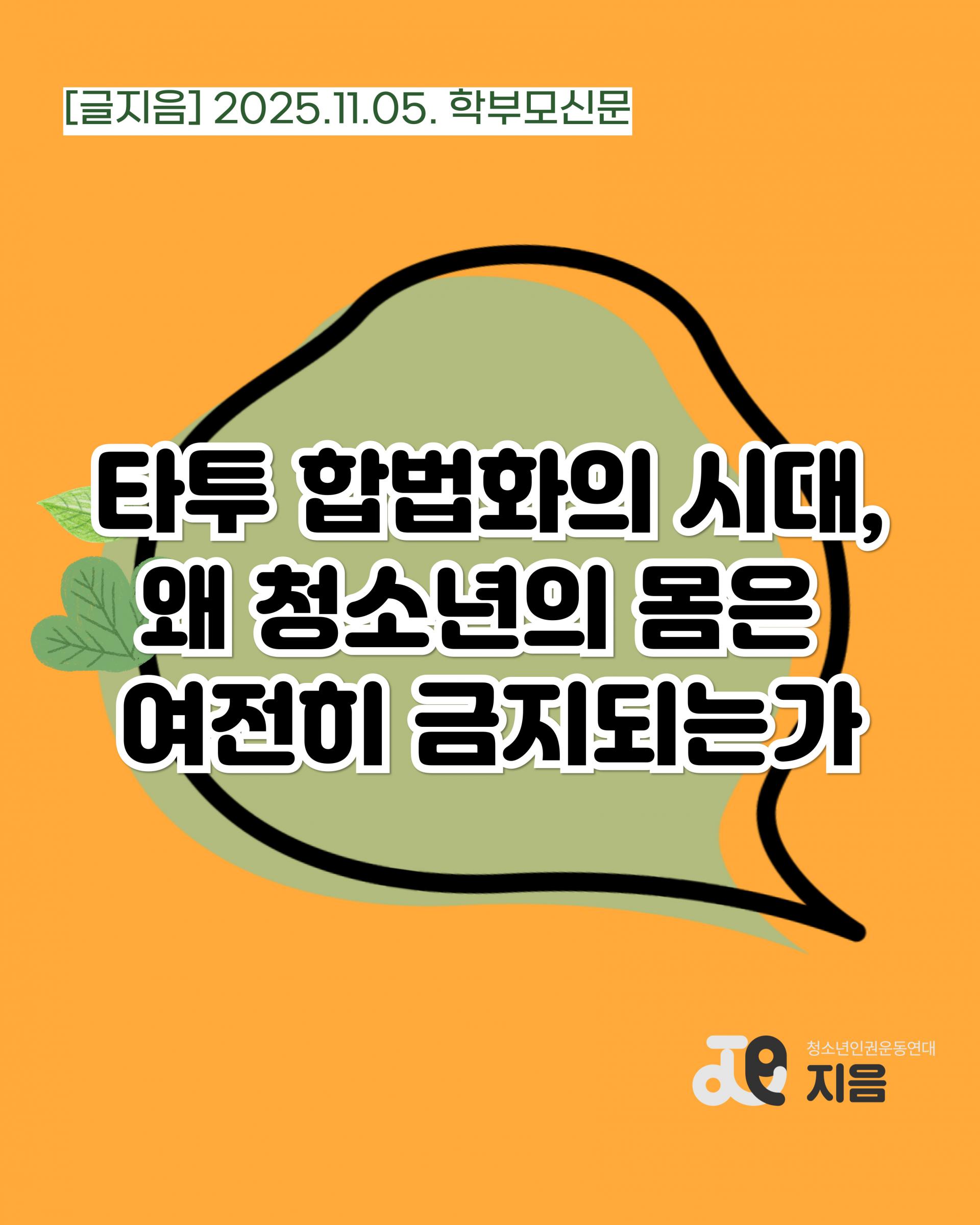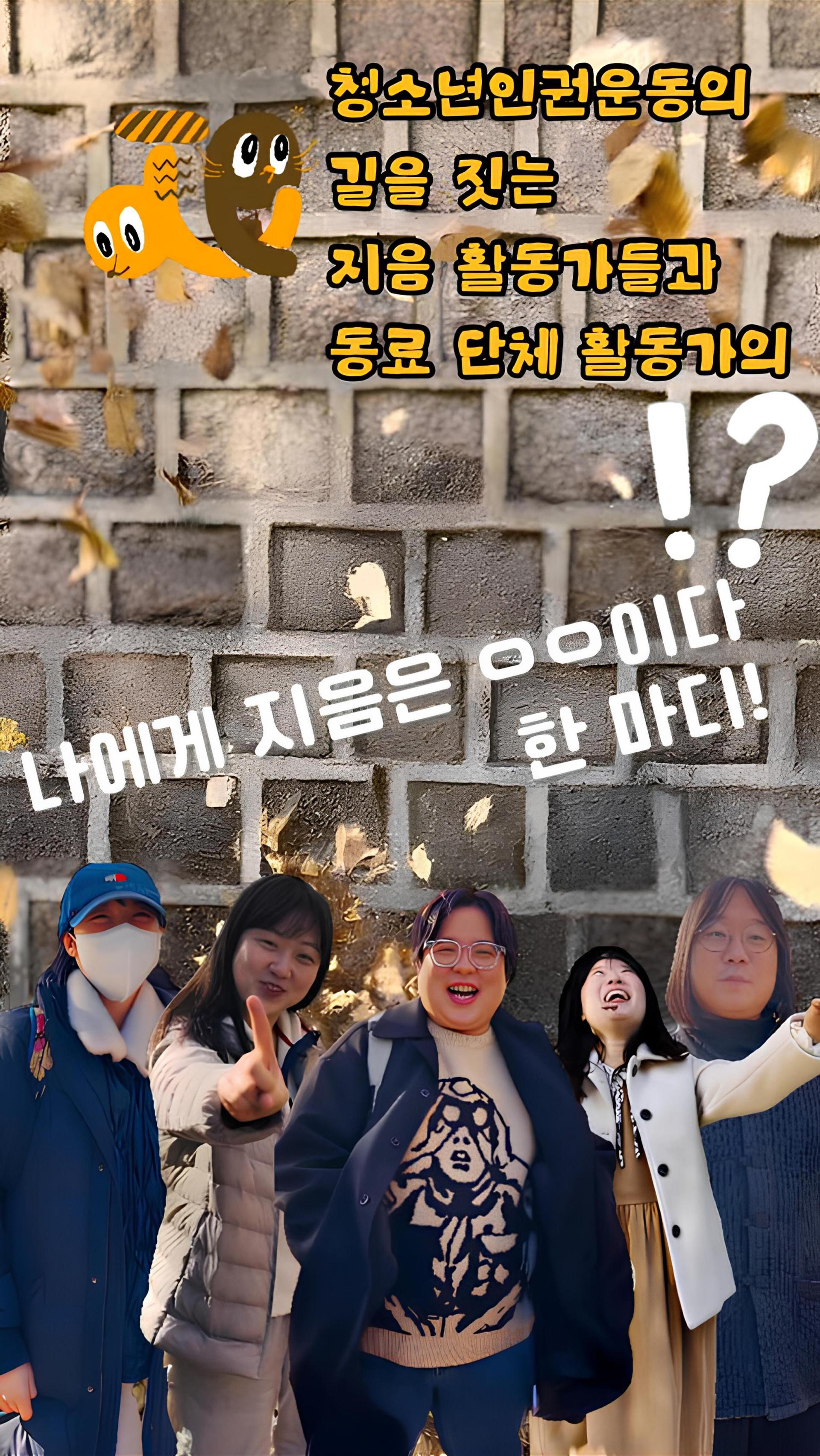 💌 2025년 11월, 상임활동가 난다의 편지와 함께 ✨ "청소년인권 바로 지금, 지음!" 우리는 좋은 어른이 많은 세상이 아니라 나쁜 어른을 만나더라도 두렵지 않은 세상을 만들어갑니다. 청소년의 자유와 존엄을 위해 청소년인권운동을 지속하고자 하는 활동가들의 단체입니다! http://yhrjieum.kr |