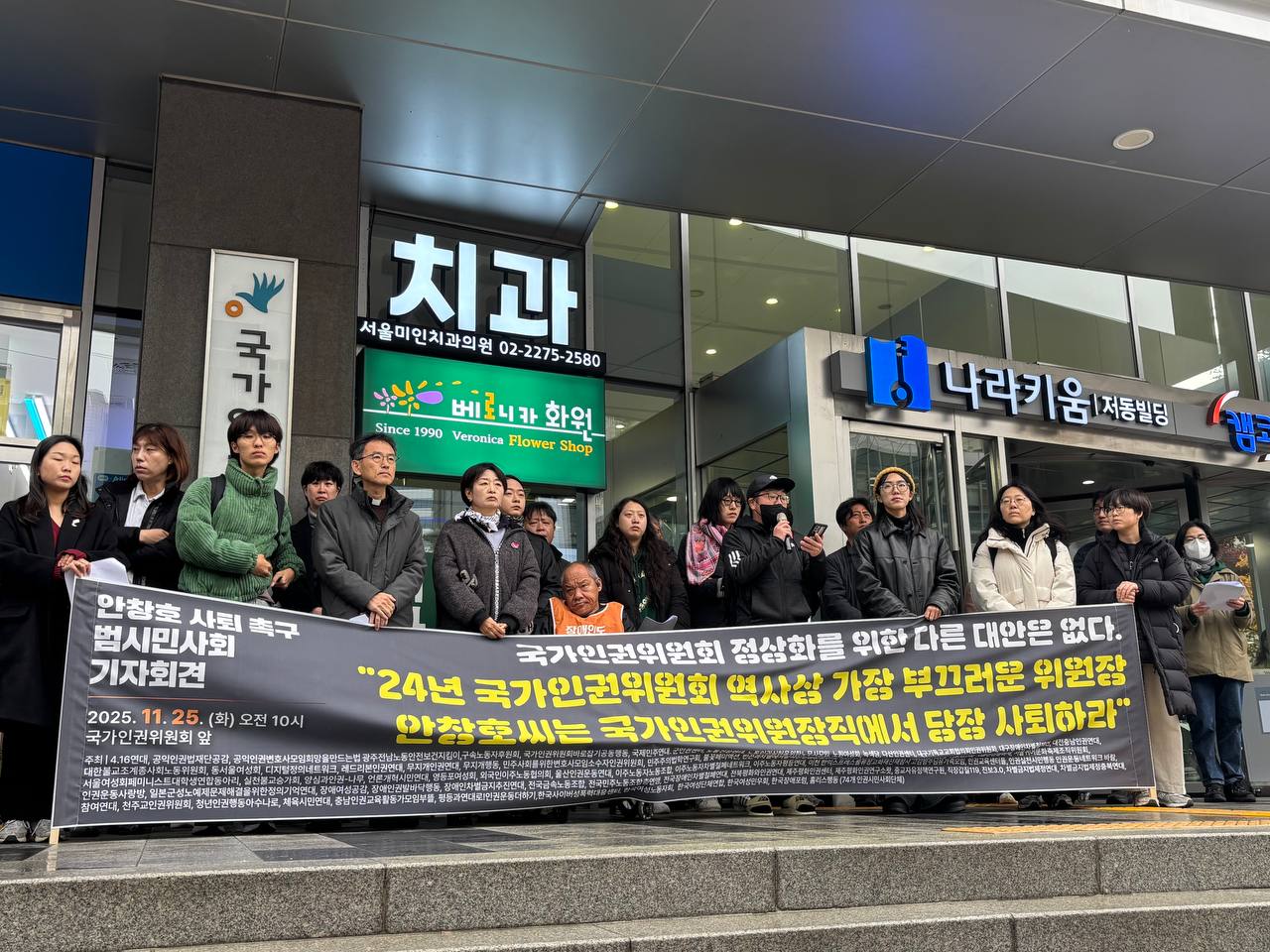| "국가인권위원장 안창호씨는 취임 1년 남짓한 기간 동안 보편적 인권 기준을 부정하는 말과 행동 그리고 국가인권위원회 결정을 반복해 왔다. 사회적 약자들에 대한 편향된 시각은 인권위원장이 갖춰야 할 기본적 자격조차 애초에 없었음의 증명이다. 그동안 안창호씨가 반복적으로 내뱉은 수많은 반인권적 언어들은 단순 실언이 아닌, 그의 생각과 삶 속에 자리 잡은 오염된 신념이고 인권감수성의 부재이다." |