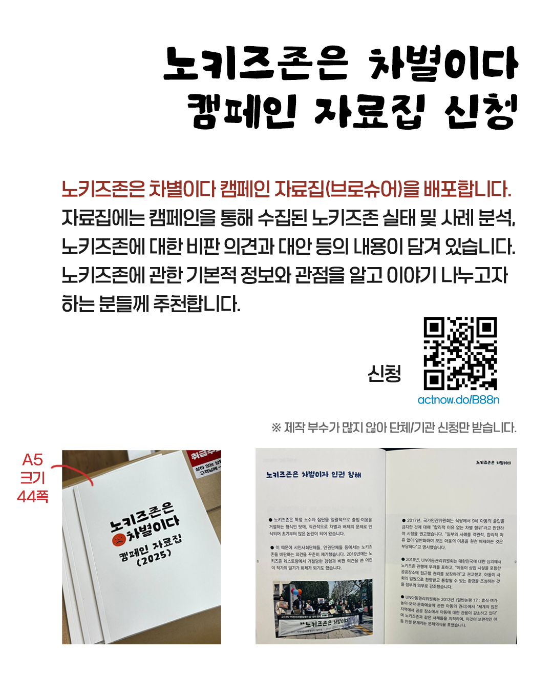 '노키즈존은 차별이다' 캠페인 자료집(브로슈어)이 나왔습니다.