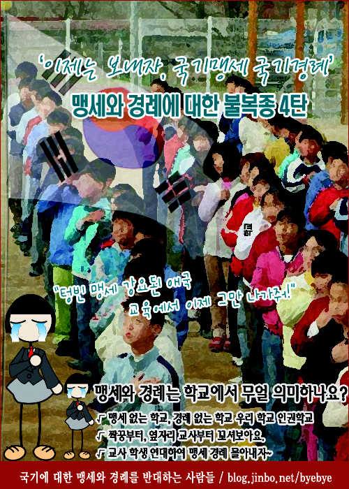 얼마 전에 국회의 큰 행사에 참석했는데 행사 시작부터 국민의례를 하더군요. 둘러보니 기립하지 않은 채 국기에 대한 경례 등을 거부한 사람은 참석자 300여 명 중 저를 비롯한 너댓 명의 청소년인권활동가들뿐인 것 같았습니다. 제 소견으론, 적어도 반절 정도는 각자의 다양한 이유로 국민의례를 거부하는 사회가 되어야, 혹은 애초에 애국과 별 상관도 없는 행사에서는 국민의례를 잘 안 하게 되어야 우리 사회가 극우화를 방지할 준비가 되었다고 할 수 있겠습니다.