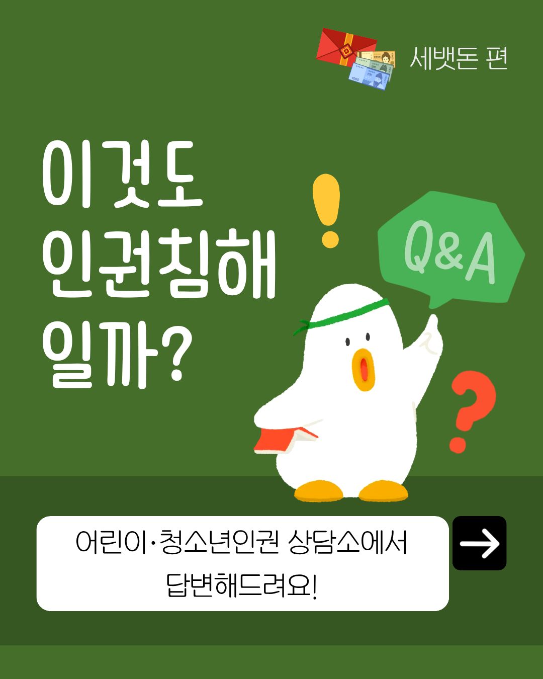 첫 번째 Q&A 카드뉴스에는 "보호자가 내 허락 없이 세뱃돈을 가져가서 써도 될까?"라는 궁금증에 대해 답하는 내용을 담았습니다.