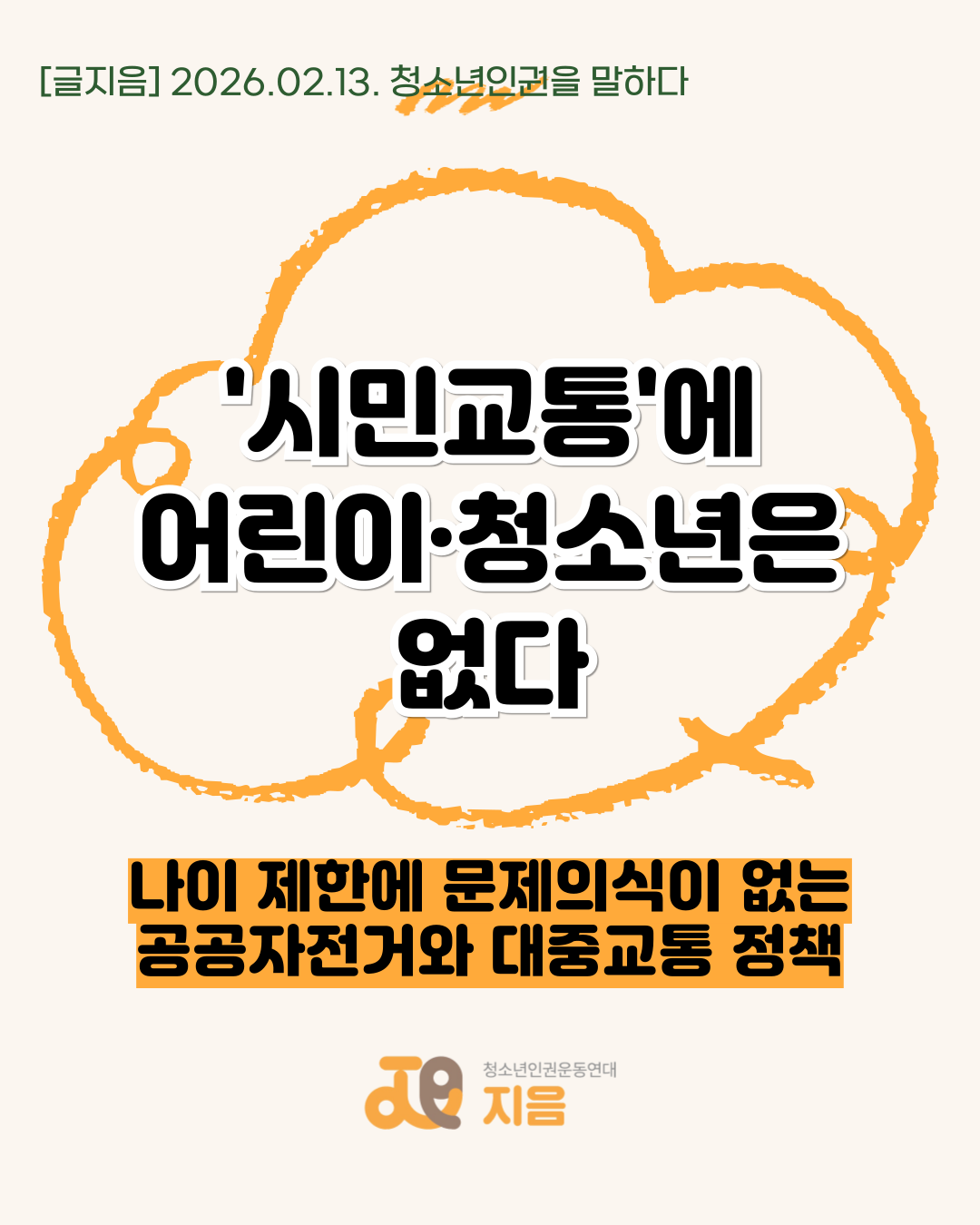 이번 [청소년인권을 말하다]에서는 대전시 공공자전거 ’타슈‘를 15세 미만 청소년은 이용할 수 없는 문제 등 대전시와 시의회가 어린이·청소년의 이동권을 외면한 과정을 짚어보고, ’모든 시민‘, ’누구나‘에서 제외된 청소년인권의 현실을 지적합니다.